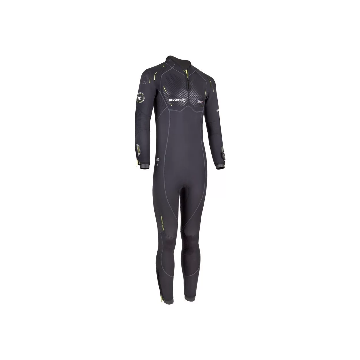 Grand zip d'aisance au niveau de la glotte équipé d'un soufflet tendu Elaskin intégrant une coupe anatomique sur la monopièce sans cagoule pour un meilleur confort. Grand Zip dorsal « G-Lock plus » (monopièce col) avec curseur métal et sous-patte au profil embossé Water Dam System pour une étanchéité accrue (brevet Beuchat) Zip poignet et cheville Renforcement du néoprène à l'extrémité de tous les Zips pour éviter tout risque de déchirure si le plongeur force en tirant sur les curseurs.